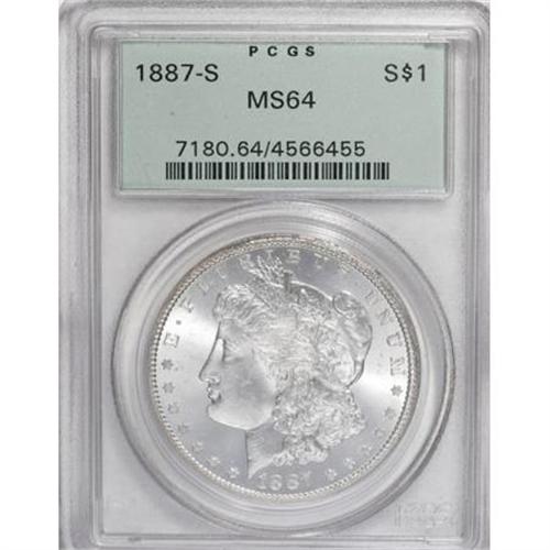 <B>1887-S $1 MS64 PCGS.</B></I> . PCGS Population (1489/339). NGC Census: (815/146). Mintage: 1,771,000. Numismedia Wsl. Price for NGC/PCGS coin in MS64: $550. (#7180)<BR><BR><B>Coin Engraver:</B> George T. Morgan<BR><BR><b>Shipping:</b> Coins & Currency (<a target="_blank" href="http://www.heritageauctions.com/common/shipping.php">view shipping information</a>)
