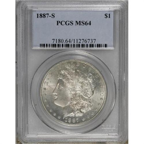 <B>1887-S $1 MS64 PCGS.</B></I> PCGS Population (1499/342). NGC Census: (818/147). Mintage: 1,771,000. Numismedia Wsl. Price for NGC/PCGS coin in MS64: $550. (#7180)<BR><BR><B>Coin Engraver:</B> George T. Morgan<BR><BR><b>Shipping:</b> Coins & Currency (<a target="_blank" href="http://www.heritageauctions.com/common/shipping.php">view shipping information</a>)