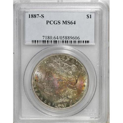 <B>1887-S $1 MS64 PCGS.</B></I> The untoned reverse yields to rainbow toning on the obverse, and lustrous surfaces exhibit well struck devices. A few minor grazes and marks preclude Gem status.<BR><BR><B>Coin Engraver:</B> George T. Morgan<BR><BR><b>Shipping:</b> Coins & Currency (<a target="_blank" href="http://www.heritageauctions.com/common/shipping.php">view shipping information</a>)