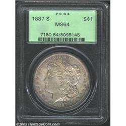 <TR><TD width="100%"><TABLE cellSpacing=1 cellPadding=3 width="100%" border=0><TBODY><TR><TD width="100%" bgColor=#79735c><FONT face=arial color=#ffffff size=3><B>Description</B> </FONT></TD></TR><TR><TD width="100%" bgColor=#ffffff><FONT face=arial size=2><B>1887-S $1 MS64 PCGS.</B></I> The iridescent lavender and honey-gold patina is sure to be appreciated by the connoisseur. A moderately prooflike near-Gem with a good strike and only lightly abraded surfaces. </FONT></TD></TR></TBODY></TABLE></TD></TR></TBODY></TABLE><BR><A name=PricesRealized></A><TABLE cellSpacing=0 cellPadding=0 width="100%" bgColor=#000000 border=0><TBODY><TR><TD width="100%"><TABLE cellSpacing=1 cellPadding=3 width="100%" border=0><TBODY><TR><TD width="100%" bgColor=#79735c><A name=PR><FONT face=arial color=#ffffff size=3><B>Previous Prices from Heritage Auctions</B> </FONT></A></TD></TR><TR><TD bgColor=#f6f6ed><TABLE cellSpacing=0 cellPadding=0 width="100%" border=1><TBODY><TR><TD align=middle width="33%"><B>Date</B></TD><TD align=middle width="33%"><B>Service</B></TD><TD align=middle width="33%"><B>Price</B></TD></TR><TR bgColor=whitesmoke><TD width="33%"><B>03/04/2003</B></TD><TD width="33%">PCGS</TD><TD width="33%">$368.00</TD></TR><TR bgColor=whitesmoke><TD width="33%"><B>02/12/2002</B></TD><TD width="33%">PCGS</TD><TD width="33%">$345.00</TD></TR><TR bgColor=whitesmoke><TD width="33%"><B>02/23/2002</B></TD><TD width="33%">PCGS</TD><TD width="33%">$460.00</TD></TR><TR bgColor=whitesmoke><TD width="33%"><B>12/04/2001</B></TD><TD width="33%">PCGS</TD><TD width="33%">$340.00</TD></TR><TR bgColor=whitesmoke><TD width="33%"><B>11/15/2001</B></TD><TD width="33%">PCGS</TD><TD width="33%">$333.50</TD></TR><TR bgColor=whitesmoke><TD width="33%"><B>11/06/2001</B></TD><TD width="33%">PCGS</TD><TD width="33%">$350.00</TD></TR><TR bgColor=whitesmoke><TD width="33%"><B>09/25/2001</B></TD><TD width="33%">PCGS</TD><TD width="33%">$350.00</TD></TR><TR bgColor=whitesmoke><TD width="33%"><B>08/05/2001</B></TD><TD width="33%">PCGS</TD><TD width="33%">$333.50</TD></TR><TR bgColor=whitesmoke><TD width="33%"><B>08/08/2001</B></TD><TD width="33%">PCGS</TD><TD width="33%">$431.25</TD></TR><TR bgColor=whitesmoke><TD width="33%"><B>08/14/2001</B></TD><TD width="33%">PCGS</TD><TD width="33%">$360.00</TD></TR><TR bgColor=whitesmoke><TD width="33%"><B>05/29/2001</B></TD><TD width="33%">PCGS</TD><TD width="33%">$340.00</TD></TR><TR bgColor=whitesmoke><TD width="33%"><B>04/10/2001</B></TD><TD width="33%">PCGS</TD><TD width="33%">$320.00</TD></TR><TR bgColor=whitesmoke><TD width="33%"><B>04/03/2001</B></TD><TD width="33%">PCGS</TD><TD width="33%">$340.00</TD></TR><TR bgColor=whitesmoke><TD width="33%"><B>03/27/2001</B></TD><TD width="33%">PCGS</TD><TD width="33%">$350.00</TD></TR><TR bgColor=whitesmoke><TD width="33%"><B>02/27/2001</B></TD><TD width="33%">PCGS</TD><TD width="33%">$340.00</TD></TR><TR bgColor=whitesmoke><TD width="33%"><B>01/05/2001</B></TD><TD width="33%">PCGS</TD><TD width="33%">$977.50</TD></TR><TR bgColor=whitesmoke><TD width="33%"><B>10/06/2000</B></TD><TD width="33%">PCGS</TD><TD width="33%">$356.50</TD></TR><TR bgColor=whitesmoke><TD width="33%"><B>03/04/1994</B></TD><TD width="33%">PCGS</TD><TD width="33%">$401.50</TD></TR><TR bgColor=whitesmoke><TD width="33%"><B>02/03/1993</B></TD><TD width="33%">PCGS</TD><TD width="33%">$522.50</TD></TR><TR bgColor=whitesmoke><TD width="33%"><B>08/01/2000</B></TD><TD width="33%">PCGS</TD><TD width="33%">$330.00</TD></TR><TR bgColor=whitesmoke><TD width="33%"><B>07/18/2000</B></TD><TD width="33%">PCGS</TD><TD width="33%">$370.00</TD></TR><TR bgColor=whitesmoke><TD width="33%"><B>09/26/1998</B></TD><TD width="33%">PCGS</TD><TD width="33%">$345.00</TD></TR><TR bgColor=whitesmoke><TD width="33%"><B>09/24/1999</B></TD><TD width="33%">PCGS</TD><TD width="33%">$402.50</TD></TR><TR bgColor=whitesmoke><TD width="33%"><B>06/01/1996</B></TD><TD width="33%">PCGS</TD><TD width="33%">$385.00</TD></TR><TR bgColor=whitesmoke><TD width="33%"><B>10/04/1995</B></TD><TD width="33%">PCGS</TD><TD width="33%">$440.00</TD></TR><TR bgColor=whitesmoke><TD width="33%"><B>02/02/1996</B></TD><TD width="33%">PCGS</TD><TD width="33%">$396.00</TD></TR><TR bgColor=whitesmoke><TD width="33%"><B>04/22/1994</B></TD><TD width="33%">PCGS</TD><TD width="33%">$385.00</TD></TR><TR bgColor=whitesmoke><TD width="33%"><B>07/31/1993</B></TD><TD width="33%">PCGS</TD><TD width="33%">$385.00</TD></TR><TR bgColor=whitesmoke><TD width="33%"><B>01/01/1998</B></TD><TD width="33%">PCGS</TD><TD width="33%">$264.00</TD></TR><TR bgColor=whitesmoke><TD width="33%"><B>05/01/2000</B></TD><TD width="33%">PCGS</TD><TD width="33%">$517.00</TD></TR><TR bgColor=whitesmoke><TD width="33%"><B>05/01/1997</B></TD><TD width="33%">PCGS</TD><TD width="33%">$880.00</TD></TR><TR bgColor=whitesmoke><TD width="33%"><B>05/02/2000</B></TD><TD width="33%">PCGS</TD><TD width="33%">$290.00</TD></TR><TR bgColor=whitesmoke><TD width="33%"><B>07/25/2000</B></TD><TD width="33%">PCGS</TD><TD width="33%">$370.00</TD></TR><TR bgColor=whitesmoke><TD width="33%"><B>08/02/1997</B></TD><TD width="33%">PCGS</TD><TD width="33%">$1,265.00</TD></TR><TR bgColor=whitesmoke><TD width="33%"><B>06/01/1996</B></TD><TD width="33%">PCGS</TD><TD width="33%">$357.50</TD></TR><TR bgColor=whitesmoke><TD width="33%"><B>05/05/2000</B></TD><TD width="33%">PCGS</TD><TD width="33%">$373.75</TD></TR><TR bgColor=whitesmoke><TD width="33%"><B>08/14/1999</B></TD><TD width="33%">PCGS</TD><TD width="33%">$391.00</TD></TR><TR bgColor=whitesmoke><TD width="33%"><B>06/04/1999</B></TD><TD width="33%">PCGS</TD><TD width="33%">$414.00</TD></TR><TR bgColor=whitesmoke><TD width="33%"><B>05/02/1997</B></TD><TD width="33%">PCGS</TD><TD width="33%">$495.00</TD></TR><TR bgColor=whitesmoke><TD width="33%"><B>01/04/1995</B></TD><TD width="33%">PCGS</TD><TD width="33%">$643.50</TD></TR><TR bgColor=whitesmoke><TD width="33%"><B>10/06/2000</B></TD><TD width="33%">PCGS</TD><TD width="33%">$316.25</TD></TR><TR bgCo
