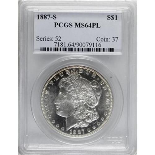 <B>1887-S $1 MS64 Prooflike PCGS.</B></I> The deeply reflective and well-preserved fields have a beautifully watery appearance and the devices are fully struck. In his silver dollar <I>Encyclopedia</B></I>, Bowers asserted that most Prooflikes from this issue are one-sided, and only reflective on the obverse, but this example is an exception to his rule, with fully Prooflike surfaces on both sides.<BR><I>From the Diamond Head Registry Set of Prooflike Dollars.</B></I><BR><BR><B>Coin Engraver:</B> George T. Morgan<BR><BR><b>Shipping:</b> Coins & Currency (<a target="_blank" href="http://www.heritageauctions.com/common/shipping.php">view shipping information</a>\)