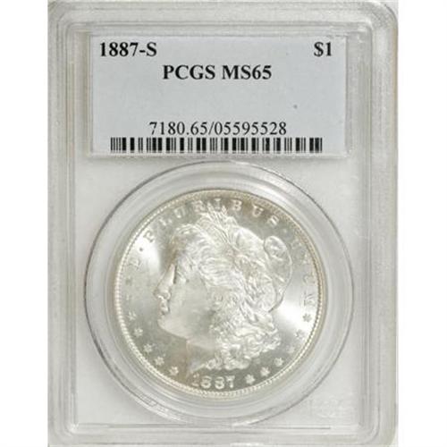 <B>1887-S $1 MS65 PCGS.</B></I> The 1887-S is one of the better date Redfield dollars. This is an exceptionally attractive coin that has thick, frosted mint luster on each side. Sharply, but not quite fully struck on each side, the cheek of Liberty is remarkably clean and problem-free. Brilliant throughout.<BR><I>From The Jimmy G. PCGS Registry Collection of Morgan Dollars with Varieties.</B></I><BR><BR><B>Coin Engraver:</B> George T. Morgan<BR><BR><b>Shipping:</b> Coins & Currency (<a target="_blank" href="http://www.heritageauctions.com/common/shipping.php">view shipping information</a>)
