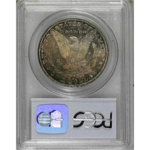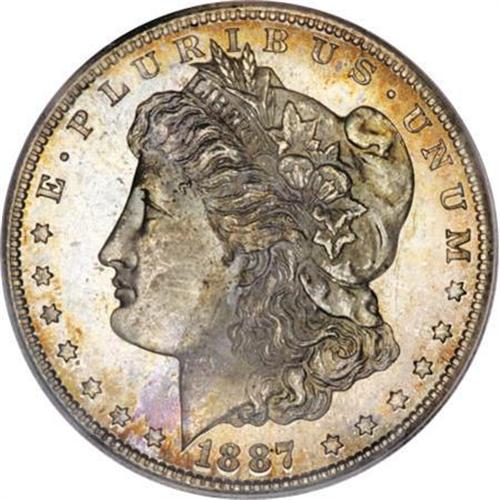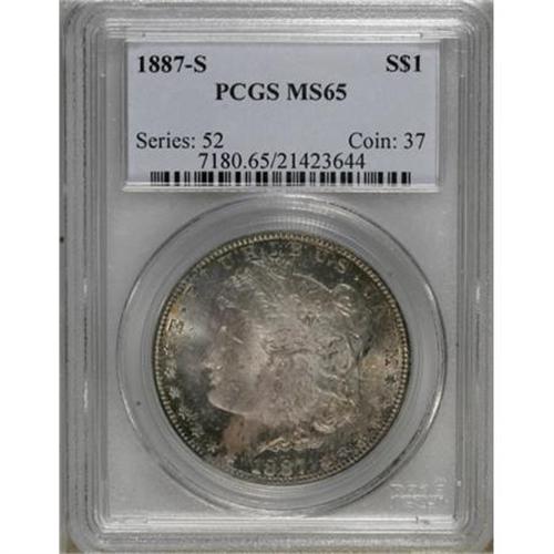 <B>1887-S $1 MS65 PCGS.</B></I> An exceptionally attractive example of this scarce Redfield issue. Uncommonly clean for a hoard coin and richly toned. Each side is covered in multiple iridescent shadings with strong underlying mint frost. Sharply defined in the center of the obverse with a bit of softness on the eagle's breast on the reverse. <BR><BR><B>Coin Engraver:</B> George T. Morgan<BR><BR><b>Shipping:</b> Coins & Currency (<a target="_blank" href="http://www.heritageauctions.com/common/shipping.php">view shipping information</a>)