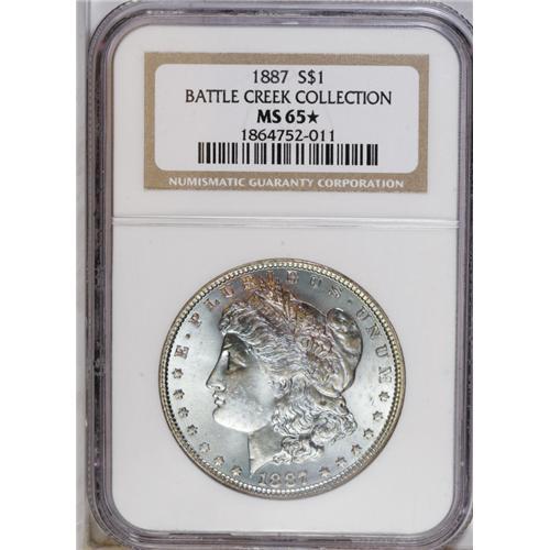 <B>1887<img border='0' src='http://www.heritagecoins.com/images/star.gif' width=10 height=10>$1> MS65 <img border='0' src='http://www.heritagecoins.com/images/star.gif' width=10 height=10> NGC.</B></I> Ex: Battle Creek Collection. Teal, plum, and red-violet patina appears on the obverse with a partial cloth pattern on the cheek and neck, while the reverse is brilliant. Some small, unobtrusive marks keep this Gem from an even higher grade.