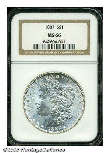 <B>1887<S$1> MS66 NGC.</B></I> Fully struck and untoned, with flashy white surfaces that display coruscating luster and only have two or three tiny marks on either side. The bright surfaces have an attractive, mildly grainy, matte-like texture on obverse and reverse alike.