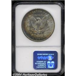 <table><tr><td><table><tr><td>1887 S$1 MS66 NGC. Well struck and fully lustrous, with beautiful electric-blue and crimson-russet peripheral toning, on both sides, a single trivial contact mark, on the cheek, and a seemingly pristine eagle's breast. An exceptionally appealing premium quality Gem. <BR><BR><B>Important notice:</B> Heritage usually auctions material at the rate of 200-250 lots per hour. On some occasions eBay Live bid software or the Internet may not be able to keep up with the pace of the auction. We recommend placing a realistic absentee bid now as insurance to avoid disappointment. Occasionally the auctioneer may eliminate or reject an eBay Live bid, and the auctioneer may also reopen a lot after the close of the eBay live bidding (usually because we missed an audience bid), and may reject your bid even if it shows you as the winning bidder. By bidding via eBay Live, you agree that Heritage may award the lot to another bidder at its sole discretion under the circumstances described above or any other reasonable circumstances. Since eBay bids are not shown to us until we open the lot on the floor, we treat those bids just like floor bids. In most cases the floor responds before the eBay bid is presented to us, due to Internet lag time, so for consistency we have made it a policy that floor bids are always considered first over tie eBay live bids. Also please note that all Heritage lots purchased through eBay Live carry a 20% Buyer's Premium. Please make sure you read the Terms and Conditions before you bid. <BR><BR><B>IMPORTANT ANNOUNCEMENT ABOUT RESERVES:</B> Heritage now divulges all reserves on its web site 7 days before every auction. If you want to know whether the reserve on this lot has been met, and if not, what the reserve amount is, please visit this lot page on the HeritageCoin.com web site, or email: bid@HeritageGalleries.com </span></font></td></tr></table></td></tr></table>