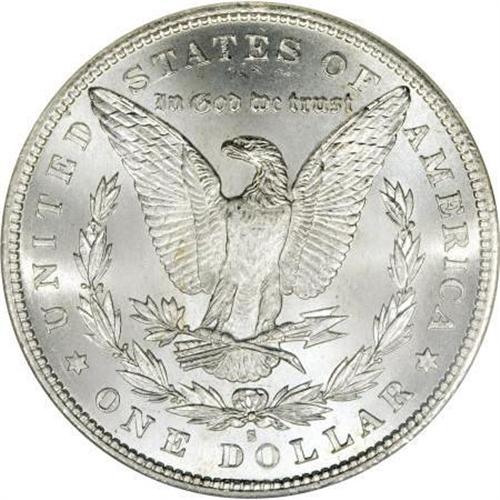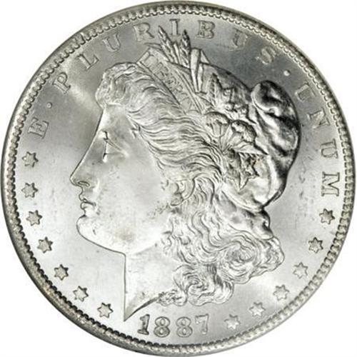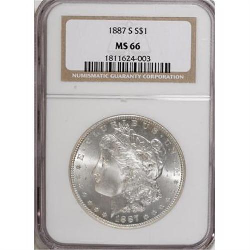 <B>1887-S $1 MS66 NGC.</B></I> Crisply struck with intense cartwheel luster over both sides and essentially brilliant, ice-white surfaces, except for faint touches of gold on the lower and central reverse. Just a few tiny marks are noted on either side. This issue was not included in the enormous Treasury hoard releases of 1962 to 1964, and survivors are scarce at the Gem level of preservation. At MS66, a scant six coins have been certified by NGC, with just one piece graded finer (12/07).<BR><I>From The Motor City Collection.</B></I><BR><BR><B>Coin Engraver:</B> George T. Morgan<BR><BR><b>Shipping:</b> Coins & Currency (<a target="_blank" href="http://www.heritageauctions.com/common/shipping.php">view shipping information</a>)