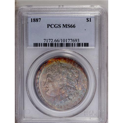 <B>1887<img border='0' src='http://www.heritagecoins.com/images/star.gif' width=10 height=10>$1> MS66 PCGS.</B></I> Partial bronze toning on the reverse echoes the variegated red, yellow, and blue of the obverse. A boldly struck and highly lustrous piece, sure to appeal to the toning enthusiast.