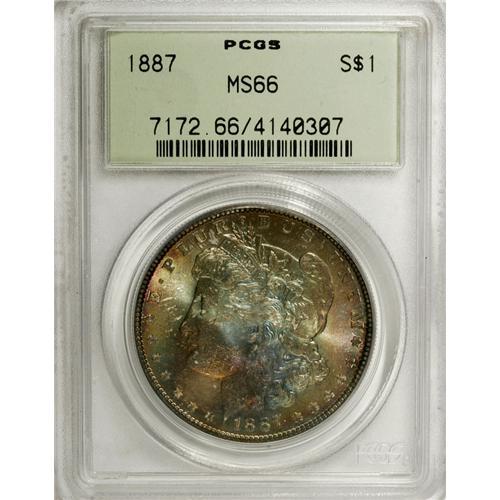 <B>1887 S$1 MS66 PCGS.</B></I> This highly lustrous Premium Gem has colorful reddish-gold, blue-green, and cerulean patina over each side. Well struck and eminently appealing.<BR><BR><b>Shipping:</b> Coin/Currency (<a target="_blank" href="http://www.heritageauctions.com/common/shipping.php">view shipping information</a>)