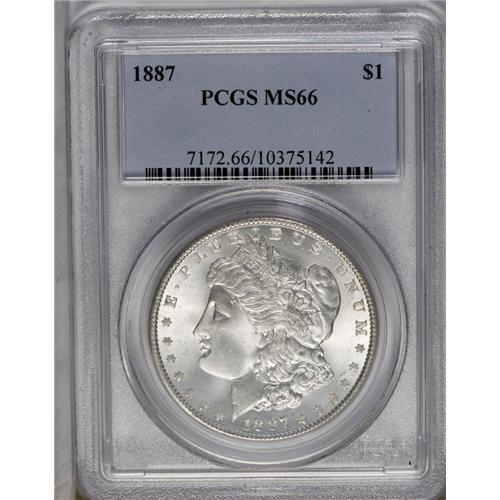 <B>1887<img border='0' src='http://www.heritagecoins.com/images/star.gif' width=10 height=10>$1> MS66 PCGS.</B></I> Untoned surfaces display a fine-grained texture and glowing luster. Minimally abraded, with adequately struck design elements.
