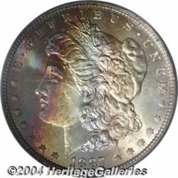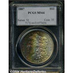 <B>1887<S$1> MS66 PCGS.</B></I> Outrageous ruby-red, antique-gold, powder-blue, and emerald-green colors dominate the obverse in a vertical streaked fashion, while the reverse is lightly toned in the upper left quadrant. This lustrous and well struck Gem has meticulously preserved surfaces.<BR><I>From the JFS Collection.</B></I> <BR><BR><B>Important notice:</B> Heritage usually auctions material at the rate of 200-250 lots per hour. On some occasions eBay Live bid software or the Internet may not be able to keep up with the pace of the auction. We recommend placing a realistic absentee bid now as insurance to avoid disappointment. Occasionally the auctioneer may eliminate or reject an eBay Live bid, and the auctioneer may also reopen a lot after the close of the eBay live bidding (usually because we missed an audience bid), and may reject your bid even if it shows you as the winning bidder. By bidding via eBay Live, you agree that Heritage may award the lot to another bidder at its sole discretion under the circumstances described above or any other reasonable circumstances. Since eBay bids are not shown to us until we open the lot on the floor, we treat those bids just like floor bids. In most cases the floor responds before the eBay bid is presented to us, due to Internet lag time, so for consistency we have made it a policy that floor bids are always considered first over tie eBay live bids. Also please note that all Heritage lots purchased through eBay Live carry a 20% Buyer's Premium. Please make sure you read the Terms and Conditions before you bid. </span></font></tr></table></td></tr></table>