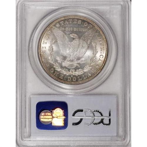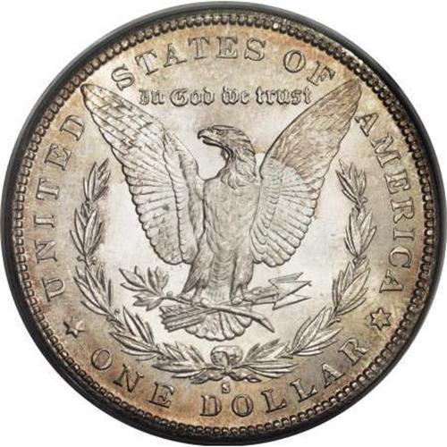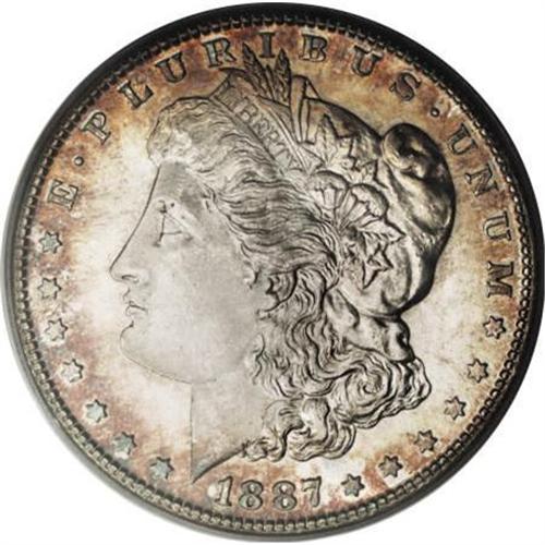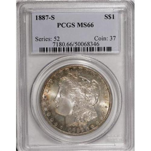 <B>1887-S $1 MS66 PCGS.</B></I> Despite a respectable mintage of more than 1.7 million pieces, this S-mint issue is elusive above MS64. The reverse is lightly toned, with reddish-golden iridescence at the borders. The obverse exhibits a wider distribution of similar colors, but deeper in hue. As befits a cartwheel from the California branch mint, the features exhibit needle-sharp delineation that brings up every last detail of the central highpoints. Both sides are largely devoid of contact marks and other distractions. This richly frosted dollar would convert even the most ardent critic into a collector of Morgans. Population: 20 in 66, 0 finer (1/08).<BR><I>From The Oxford Collection.</B></I><BR><BR><B>Coin Engraver:</B> George T. Morgan<BR><BR><b>Shipping:</b> Coins & Currency (<a target="_blank" href="http://www.heritageauctions.com/common/shipping.php">view shipping information</a>)
