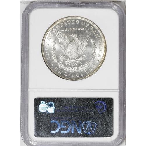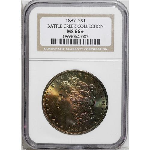 <B>1887<img border='0' src='http://www.heritagecoins.com/images/star.gif' width=10 height=10>$1> MS66 <img border='0' src='http://www.heritagecoins.com/images/star.gif' width=10 height=10> NGC.</B></I> Ex: Battle Creek Collection. In Premium Gem with Star, this coin's grade, NGC has seen 43 specimens, and a mere four finer with Star (7/06). Highly lustrous surfaces are toned in medium aqua-green, crimson, purple, and yellow-gold, and the design is bold.