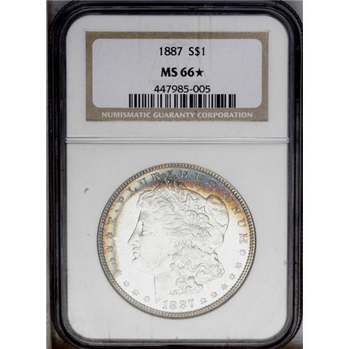 <B>1887<img border='0' src='http://www.heritagecoins.com/images/star.gif' width=10 height=10>$1> MS66 <img border='0' src='http://www.heritagecoins.com/images/star.gif' width=10 height=10> NGC.</B></I> Multicolor arcs of orange, ruby, and aquamarine iridescence dominate the obverse border between 8 and 3 o'clock. The centers are slightly soft, but the preservation is splendid. The base of the 1 in the date is repunched. <BR><BR><B>Important notice:</B> Heritage usually auctions material at the rate of 200-250 lots per hour. On some occasions eBay Live bid software or the Internet may not be able to keep up with the pace of the auction. We recommend placing a realistic absentee bid now as insurance to avoid disappointment. Occasionally the auctioneer may eliminate or reject an eBay Live bid, and the auctioneer may also reopen a lot after the close of the eBay live bidding (usually because we missed an audience bid), and may reject your bid even if it shows you as the winning bidder. By bidding via eBay Live, you agree that Heritage may award the lot to another bidder at its sole discretion under the circumstances described above or any other reasonable circumstances. Since eBay bids are not shown to us until we open the lot on the floor, we treat those bids just like floor bids. In most cases the floor responds before the eBay bid is presented to us, due to Internet lag time, so for consistency we have made it a policy that floor bids are always considered first over tie eBay live bids. Also please note that all Heritage lots purchased through eBay Live carry a 20% Buyer's Premium. Please make sure you read the Terms and Conditions before you bid. This lot is being auctioned in conjunction with a live floor auction by Heritage Galleries & Auctioneers. All final auction and invoice information will be supplied by Heritage Galleries & Auctioneers, and all other information should be considered preliminary. Lot:3469 <BR><BR><B>Winning Notification and Billing:</B> After the FINAL session in this auction is complete, Heritage will send e-mail and snail mail invoices. This process normally takes several days. All final auction and invoice information will be supplied by Heritage Galleries & Auctioneers, and all other information should be considered preliminary. <BR><BR>This auction will be conducted on a live auction floor and over the Internet through eBay Live. If you choose to place an absentee bid, please take a moment to <font color='#0000ff'><u><a href='http://pages.ebay.com/liveauctions/help/before/laabsentee.html'>learn how eBay Live absentee bidding works</a></u></font><font color='#000000'>
