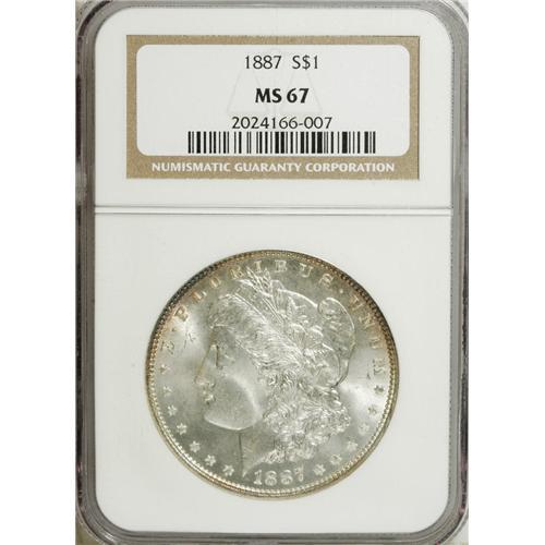 <B>1887 S$1 MS67 NGC.</B></I> A sharply detailed Superb Gem with a hint of lilac and gold toning along the borders on each side. This wonderful example has pristine silver surfaces that are void of noticeable imperfections.<BR><BR><b>Shipping:</b> Coins & Currency (<a target="_blank" href="http://www.heritageauctions.com/common/shipping.php">view shipping information</a>)