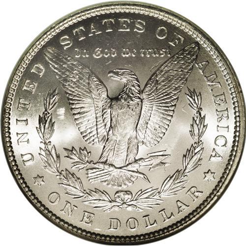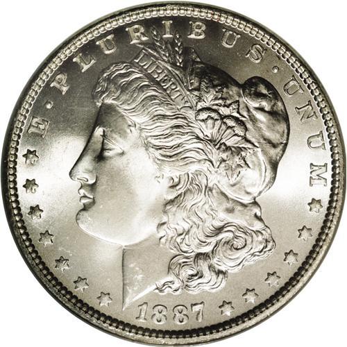 <B>1887<img border='0' src='http://www.heritagecoins.com/images/star.gif' width=10 height=10>$1> MS67 NGC.</B></I> A spectacular Superb Gem example with intensely lustrous and frosty silver surfaces. There is not evidence of toning on either side of this aesthetically desirable Morgan dollar. Although the grading services have certified quite a few of these at this grade level, PCGS and NGC have each graded just one finer coin.