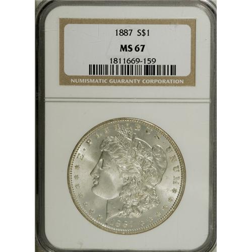 <B>1887 S$1 MS67 NGC.</B></I> Highly lustrous with above-average definition overall. Occasional wisps of blue and pink patina grace the minimally marked fields. NGC has certified a mere two coins finer (1/07).<BR><BR><b>Shipping:</b> Coins & Currency (<a target="_blank" href="http://www.heritageauctions.com/common/shipping.php">view shipping information</a>)
