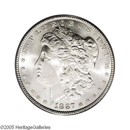 <B>1887<S$1> MS67 PCGS.</B></I> Brilliant, fully struck, and displaying intense mint luster--just the appearance one would expect from this common date dollar in uncommonly high condition. A perfect type piece. Population: 48 in 67, 1 finer (11/05).