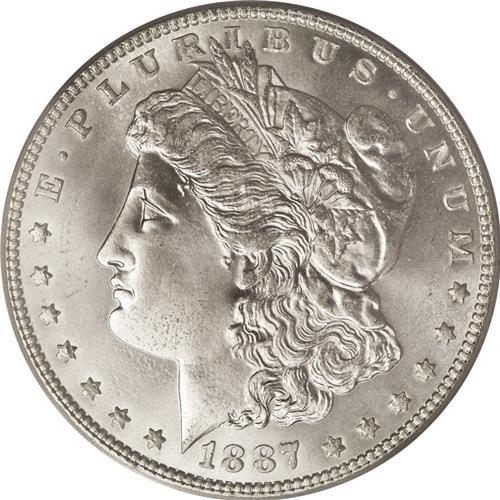 <B>1887<img border='0' src='http://www.heritagecoins.com/images/star.gif' width=10 height=10>$1> MS67 PCGS.</B></I> Frosty and untoned, with swirling cartwheel luster, this piece approaches perfection, save for a few of the most minute luster grazes, none in the prime focal areas. The only mentionable quibble is a bit of central strike softness, as often seen on this issue. Both NGC and PCGS combined have certified only three coins finer. Population: 53 in 67, 1 finer (6/06).