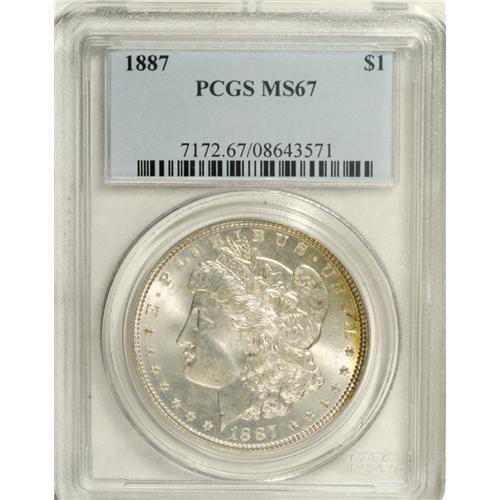 <B>1887 S$1 MS67 PCGS.</B></I> Highly lustrous and solidly struck with a trace of golden-orange toning near the rims. Only trivial marks are present on each side of this Superb Gem. PCGS has graded only one coin finer (1/07).<BR><BR><b>Shipping:</b> Coins & Currency (<a target="_blank" href="http://www.heritageauctions.com/common/shipping.php">view shipping information</a>)