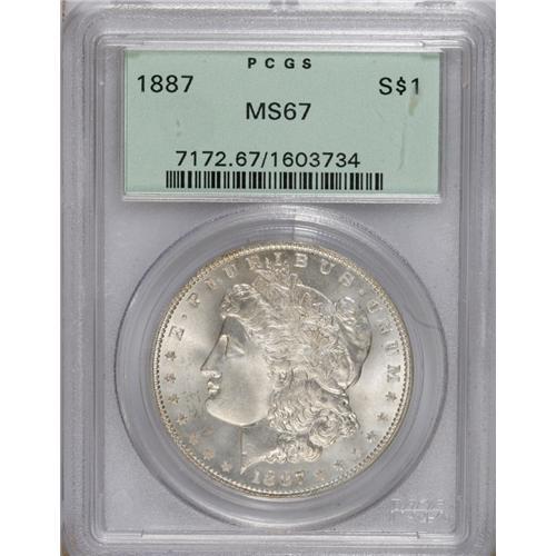 <B>1887 S$1 MS67 PCGS.</B></I> Strongly lustrous with above-average detail for this issue. Each side has a hint of pale green toning over the carefully preserved fields. PCGS has graded just one coin finer (2/07).<BR><BR><b>Shipping:</b> Coins & Currency (<a target="_blank" href="http://www.heritageauctions.com/common/shipping.php">view shipping information</a>)