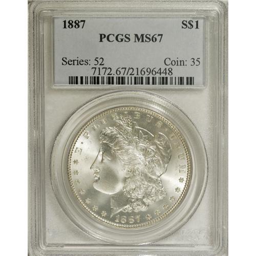 <B>1887 S$1 MS67 PCGS.</B></I> This is a fully brilliant Superb Gem example with frosty silver luster and no indication of toning on either side. The reverse has a tiny spot at the N of UNITED. Population: 56 in 67, 1 finer (2/07).<BR><I>From The Jackson Hole Collection.</B></I><BR><BR><b>Shipping:</b> Coins & Currency (<a target="_blank" href="http://www.heritageauctions.com/common/shipping.php">view shipping information</a>)