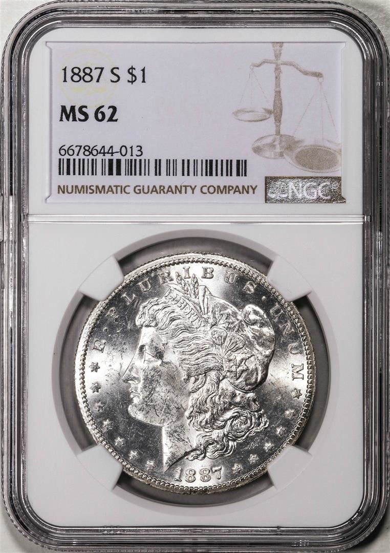 One 1887-S $1 Morgan Silver Dollar Coin NGC MS62. NGC Certified.
