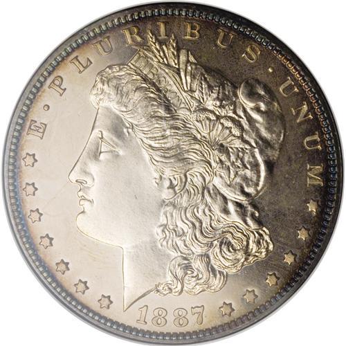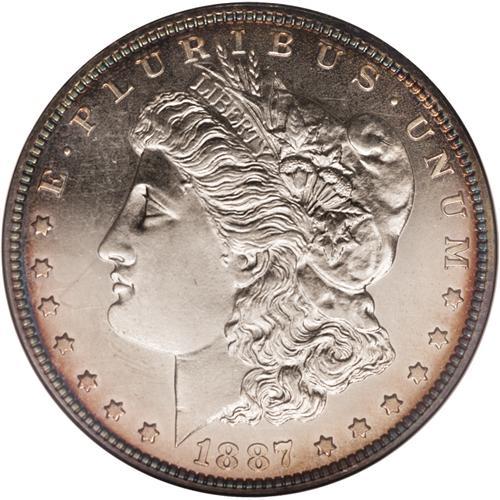 <B>1887 S$1 PR63 NGC.</B></I> Golden-brown shades lighten as they approach the centers, and the rims are ocean-blue. The strike is penetrating, and the few hairlines detected upon strong magnification are of little consequence. Slight repunching is noted on the peak of the 7 in the date.<BR><BR><b>Shipping:</b> Coin/Currency (<a target="_blank" href="http://www.heritageauctions.com/common/shipping.php">view shipping information</a>) <BR><BR><B>Importa