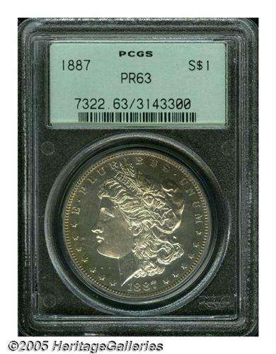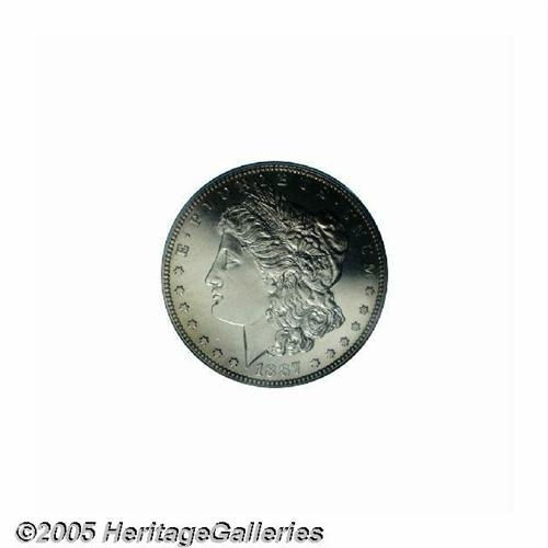 <B>1887<S$1> PR63 PCGS.</B></I> An attractive specimen kept from a higher grade by a minor graze on the cheekbone and a small area of rough surface northeast of the E in STATES. The major devices are not only exactingly struck, but they exhibit moderate contrast with the reflective, honey-tinged fields. The older generation PCGS holder, however, does not possess a Cameo designation. A scant 710 proofs were struck.<BR><I>From The Dr. John L. Pellegrini Collection.</B></I>