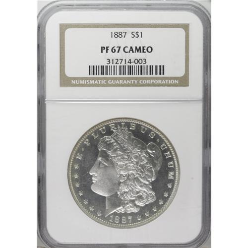 <B>1887 S$1 PR67 Cameo NGC.</B></I> The peak of the 7 in the date is lightly repunched. The NGC Census shows that this beautiful piece is tied with seven others for the finest-certified Cameo proof of the date. This service has only certified a single Ultra Cameo proof (at PR65), and they have graded just one non-cameo PR68 example. This is a splendid Superb Gem with traces of golden color on both sides, along with considerable Cameo contrast. The striking details are simply outstanding, even for a proof, and are noticeably better than usual on and just above Liberty's ear, as well as on the eagle's breast, wings, and talons. The obverse and reverse denticles are all fully and crisply formed. Census: 8 in 67 Cameo, 0 finer (11/06).<BR><I>From The Dr. Robert J. Loewinger Collection.</B></I><BR><BR><b>Shipping:</b> Coin/Currency (<a target="_blank" href="http://www.heritageauctions.com/common/shipping.php">view shipping information</a>) <BR><BR><B>Important not