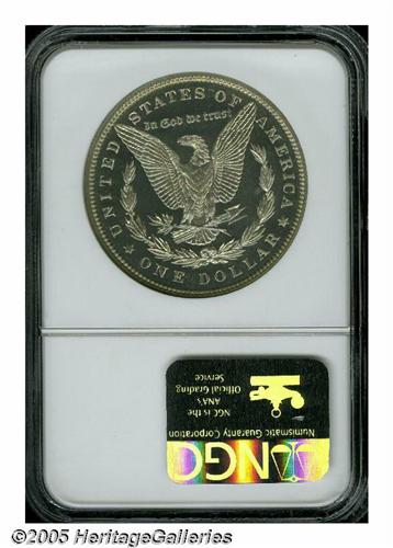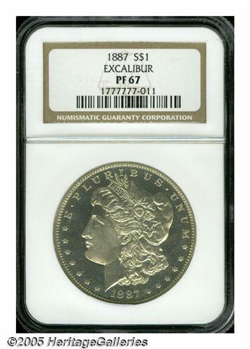 <B>1887<S$1> PR67 NGC.</B></I> Ex: Excalibur Collection. A nearly peerless Superb Gem, the expertly preserved surfaces are at the threshold of numismatic perfection. Boldly struck throughout, the glassy features sparkle beneath pale golden overtones. This is a coin that would do justice to the finest type collection. Population: 5 in 67, 1 finer (6/05).