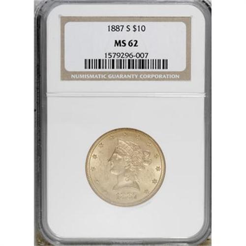 <B>1887-S $10 MS62 NGC.</B></I> NGC Census: (367/51). PCGS Population (212/66). Mintage: 817,000. Numismedia Wsl. Price for NGC/PCGS coin in MS62: $500. (#8711)<BR><BR><B>Coin Engraver:</B> Christian Gobrecht<BR><BR><b>Shipping:</b> Coins & Currency (<a target="_blank" href="http://www.heritageauctions.com/common/shipping.php">view shipping information</a>)