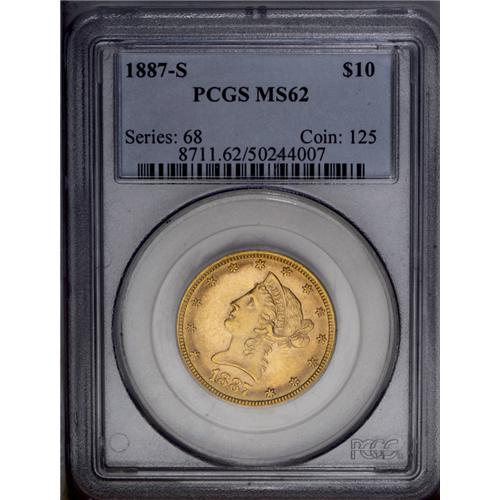 <B>1887-S<$10> MS62 PCGS.</B></I> A brilliant example of this scarce condition rarity. Frosty yellow-gold surfaces with light abrasions. While the mintage was a substantial 817,000 coins, most entered circulation, and today, pleasing Mint State examples are hard to locate. Population: 167 in 62, 49 finer (3/06). <BR><BR><B>Important notice:</B> Heritage usually auctions material at the rate of 200-250 lots per hour. On some occasions eBay Live bid software or the Internet may not be able to keep up with the pace of the auction. We recommend placing a realistic absentee bid now as insurance to avoid disappointment. Occasionally the auctioneer may eliminate or reject an eBay Live bid, and the auctioneer may also reopen a lot after the close of the eBay live bidding (usually because we missed an audience bid), and may reject your bid even if it shows you as the winning bidder. By bidding via eBay Live, you agree that Heritage may award the lot to another bidder at its sole discretion under the circumstances described above or any other reasonable circumstances. Since eBay bids are not shown to us until we open the lot on the floor, we treat those bids just like floor bids. In most cases the floor responds before the eBay bid is presented to us, due to Internet lag time, so for consistency we have made it a policy that floor bids are always considered first over tie eBay live bids. Also please note that all Heritage lots purchased through eBay Live carry a 20% Buyer's Premium. Please make sure you read the Terms and Conditions before you bid. This lot is being auctioned in conjunction with a live floor auction by Heritage Galleries & Auctioneers. All final auction and invoice information will be supplied by Heritage Galleries & Auctioneers, and all other information should be considered preliminary. Lot:4008 <BR><BR><B>Winning Notification and Billing:</B> After the FINAL session in this auction is complete, Heritage will send e-mail and snail mail invoices. This process normally takes several days. All final auction and invoice information will be supplied by Heritage Galleries & Auctioneers, and all other information should be considered preliminary. <BR><BR>This auction will be conducted on a live auction floor and over the Internet through eBay Live. If you choose to place an absentee bid, please take a moment to <font color='#0000ff'><u><a href='http://pages.ebay.com/liveauctions/help/before/laabsentee.html'>learn how eBay Live absentee bidding works</a></u></font><font color='#000000'>