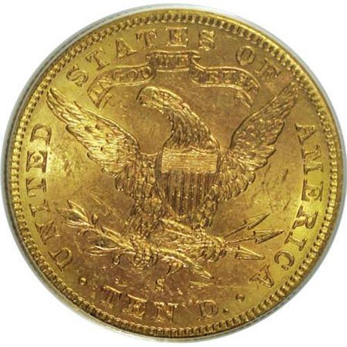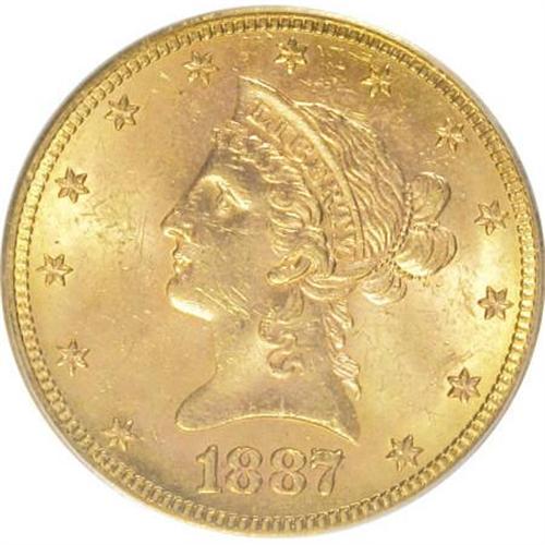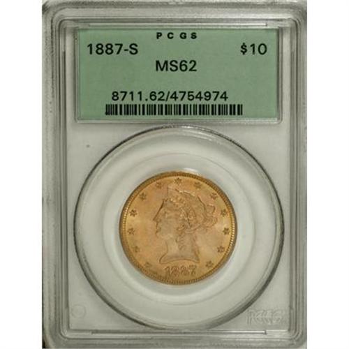 <B>1887-S $10 MS62 PCGS.</B></I> PCGS Population (232/70). NGC Census: (373/52). Mintage: 817,000. Numismedia Wsl. Price for NGC/PCGS coin in MS62: $500. (#8711)<BR><BR><B>Coin Engraver:</B> Christian Gobrecht<BR><BR><b>Shipping:</b> Coins & Currency (<a target="_blank" href="http://www.heritageauctions.com/common/shipping.php">view shipping information</a>)