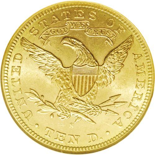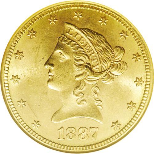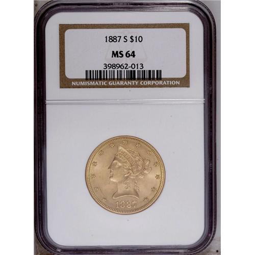 <B>1887-S<$10> MS64 NGC.</B></I> A boldly struck and bright example that has good luster and only lightly abraded fields. The fields present a medium copper-gold appearance, a ring of olive-gold color circles the peripheries. Although this issue is not uncommon in baggy Uncirculated grades, it becomes very rare in Choice condition. In fact, this is the first MS64 '87-S ten we have had the opportunity to offer at auction. Census: 5 in 64, 1 finer (1/06).