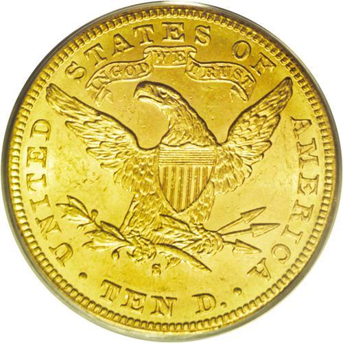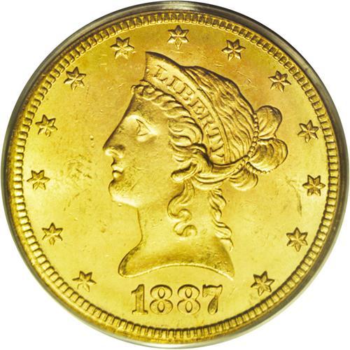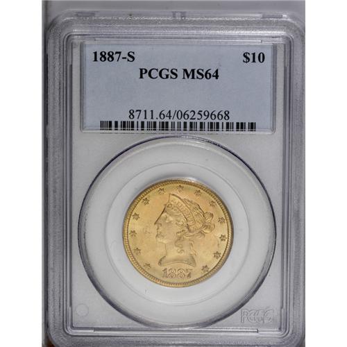 <B>1887-S<$10> MS64 PCGS.</B></I> The Choice level of preservation is uncommonly high for a survivor of this 817,000-piece S-mint eagle, as most survivors remain in the MS63 and lower category. The present representative displays original antique-gold overtones and more deeply set green-gold color at the peripheries on each side. Fully struck throughout with a typical abrasion count for the assigned grade. Population at both services combined: 6 in 64, 1 finer (7/06).