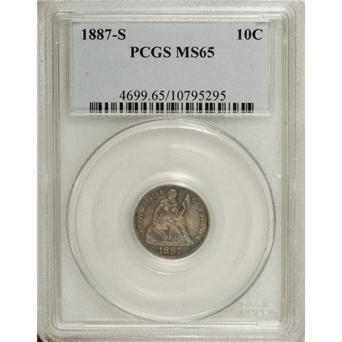 <B>1887-S 10C MS65 PCGS.</B></I> Highly lustrous beneath delicate lavender-gold and plum patina. The strike is solid, and the overall level of preservation is remarkable. An attractive example of this later branch mint Seated dime. Population: 21 in 65, 3 finer (3/07).<BR><BR><b>Shipping:</b> Coins & Currency (<a target="_blank" href="http://www.heritageauctions.com/common/shipping.php">view shipping information</a>)