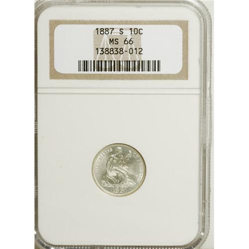 <B>1887-S 10C MS66 NGC.</B></I> Fabulously well-preserved and essentially untoned with excellent detail overall. This delightful Premium Gem has an interesting feature at the date, with the 7 more deeply impressed than the rest of the digits. Census: 7 in 66, 1 finer (4/07).<BR><BR><b>Shipping:</b> Coins & Currency (<a target="_blank" href="http://www.heritageauctions.com/common/shipping.php">view shipping information</a>)