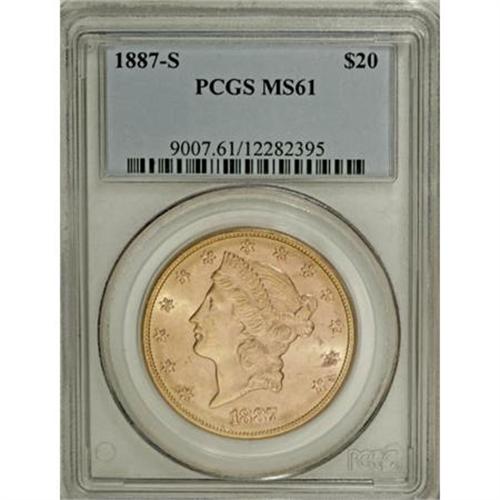 <B>1887-S $20 MS61 PCGS.</B></I> A bright, light pink-gold example with cleaner fields and devices than the grade would suggest. The luster presents an active cartwheel effect and the overall appeal is considerable. <BR><BR><B>Coin Engraver:</B> James B. Longacre<BR><BR><b>Shipping:</b> Coins & Currency (<a target="_blank" href="http://www.heritageauctions.com/common/shipping.php">view shipping information</a>)