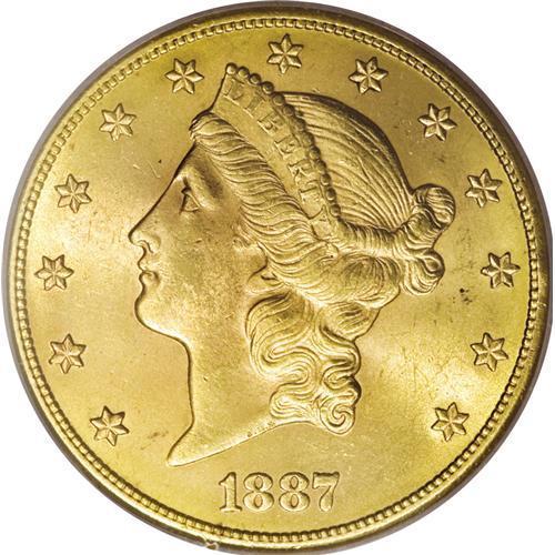 <B>1887-S $20 MS63 PCGS.</B></I> Like so many other San Francisco Mint double eagles, this date is an important condition rarity, common enough in lower grades that any collector can own an example, but elusive in better Mint State grades. Consider the total PCGS population that includes 181 circulated examples, another 348 pieces in grades from MS60 through MS62, but just 52 coins in MS63 or finer grades. This example is a remarkable piece with frosty yellow-gold luster and faint pinkish overtones. The devices are all sharply impressed on both sides. Also consider that the San Francisco Mint piece of this date is the only collectible double eagle issued during the year as the Philadelphia Mint only produced proofs. Population: 48 in 63, 4 finer (12/06).<BR><BR><b>Shipping:</b> Coins & Currency (<a target="_blank" href="http://www.heritageauctions.com/common/shipping.php">view shipping information</a>)