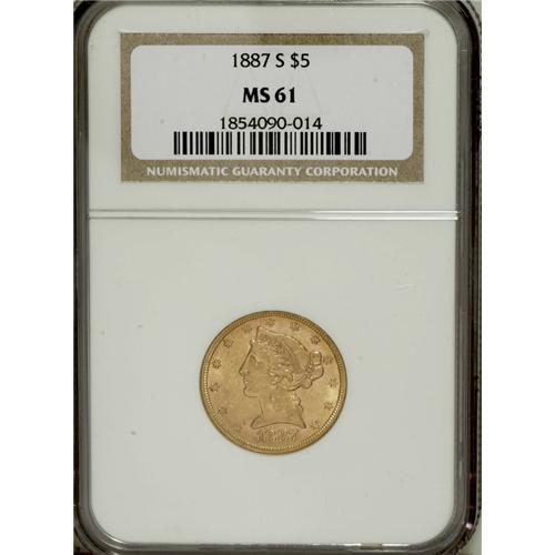 1887-S $5 MS61 NGC. NGC Census: (665/1140). PCGS P