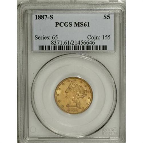 1887-S $5 MS61 PCGS. PCGS Population (309/663). NG