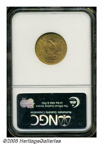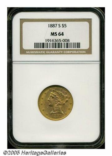 <B>1887-S<$5> MS64 NGC.</B></I> This sharply struck example has frosty yellow luster with attractive pink highlights. The surfaces are pleasing, and quite clean for the grade.