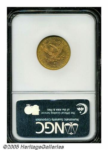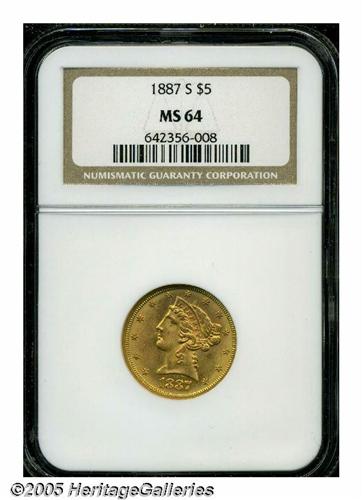 <B>1887-S<$5> MS64 NGC.</B></I> Vivid orange and olive colors adorn this lustrous and lightly marked representative. Well struck, and conditionally challenging at this level of preservation. Population: 37 in 64, 4 finer (4/05).