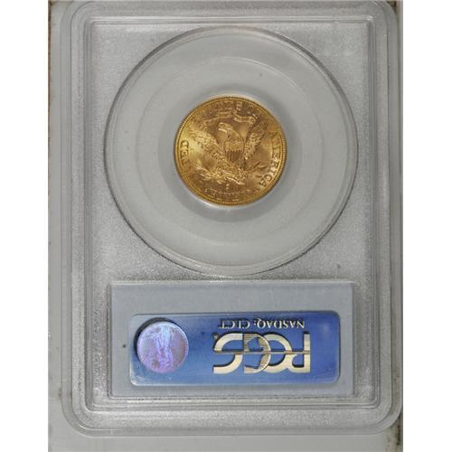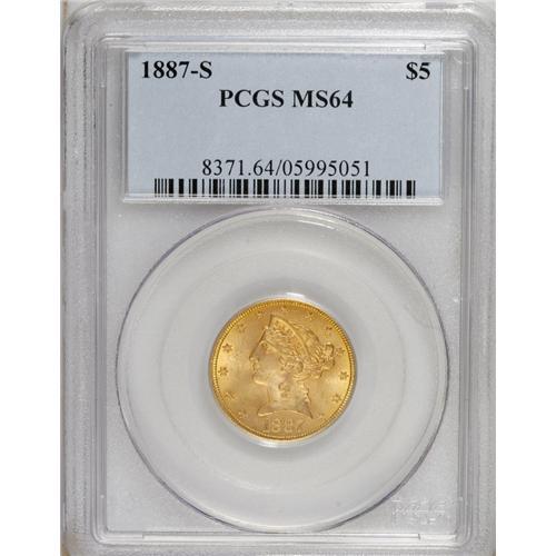 <B>1887-S $5 MS64 PCGS.</B></I> Choice and solidly struck with pleasing luster. This lovely yellow-orange representative is surprisingly clean and has only a handful of trivial marks in the fields. The 1887-S pieces are the only business strike half eagles from that year, as the Philadelphia issue was proof-only. Population: 37 in 64, 3 finer (2/07).<BR><BR><b>Shipping:</b> Coins & Currency (<a target="_blank" href="http://www.heritageauctions.com/common/shipping.php">view shipping information</a>)