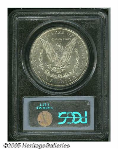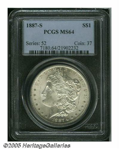 <B>1887-S<S$1> MS64 PCGS.</B></I> Well struck and essentially untoned, save for scattered tan specks on each side, with bright satiny luster that approaches semi-prooflikeness in the fields, and is abraded to a degree which seems consistent with the assigned grade. Faint roller marks (as struck) travel across Liberty's ear and jaw.