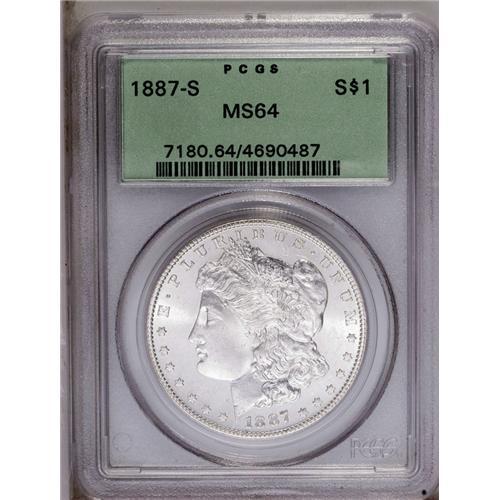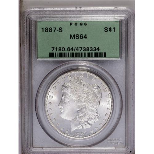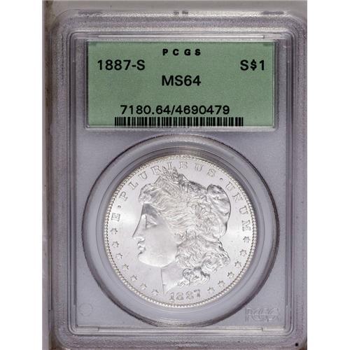 1887-S S$1 MS64 PCGS, five green label holder examples