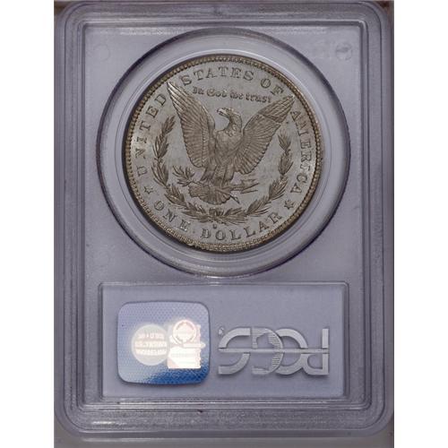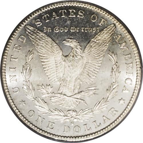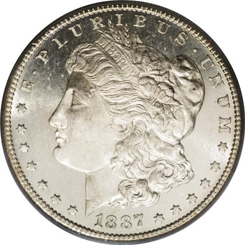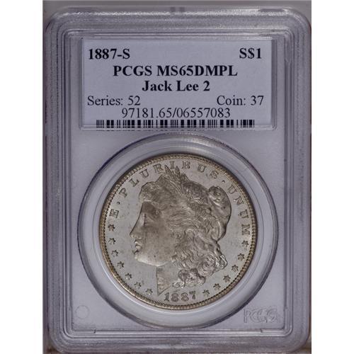 <B>1887-S<img border='0' src='http://www.heritagecoins.com/images/star.gif' width=10 height=10>$1> MS65 Deep Mirror Prooflike PCGS.</B></I> Ex: Jack Lee 2. The 1887-S is a better date within the series, and its mintage of 1.771 million pieces compares favorably with the combined mintage of more than 31 million pieces at the Philadelphia and New Orleans Mints that year. This is an essentially brilliant coin, and the devices are heavily frosted, set off starkly against the "blackness" of the mirrored fields. Well struck throughout, and splendidly preserved aside from a reeding mark on the right (facing) wing. The only Deep Mirror Prooflike Gem certified by either PCGS or NGC. A significant offering for the Morgan dollar specialist. Population: 1 in 65 Deep Mirror Prooflike, 0 finer (4/06).