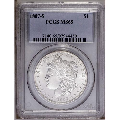 <B>1887-S<img border='0' src='http://www.heritagecoins.com/images/star.gif' width=10 height=10>$1> MS65 PCGS.</B></I> Examples of this date are generally available in all grades short of Gem condition, but MS65 or finer examples are highly elusive. This beauty has satiny silver luster on both sides with a reflective reverse field. PCGS has graded 22 finer (3/06). <BR><BR><B>Important notice:</B> Heritage usually auctions material at the rate of 200-250 lots per hour. On some occasions eBay Live bid software or the Internet may not be able to keep up with the pace of the auction. We recommend placing a realistic absentee bid now as insurance to avoid disappointment. Occasionally the auctioneer may eliminate or reject an eBay Live bid, and the auctioneer may also reopen a lot after the close of the eBay live bidding (usually because we missed an audience bid), and may reject your bid even if it shows you as the winning bidder. By bidding via eBay Live, you agree that Heritage may award the lot to another bidder at its sole discretion under the circumstances described above or any other reasonable circumstances. Since eBay bids are not shown to us until we open the lot on the floor, we treat those bids just like floor bids. In most cases the floor responds before the eBay bid is presented to us, due to Internet lag time, so for consistency we have made it a policy that floor bids are always considered first over tie eBay live bids. Also please note that all Heritage lots purchased through eBay Live carry a 20% Buyer's Premium. Please make sure you read the Terms and Conditions before you bid. This lot is being auctioned in conjunction with a live floor auction by Heritage Galleries & Auctioneers. All final auction and invoice information will be supplied by Heritage Galleries & Auctioneers, and all other information should be considered preliminary. Lot:3482 <BR><BR><B>Winning Notification and Billing:</B> After the FINAL session in this auction is complete, Heritage will send e-mail and snail mail invoices. This process normally takes several days. All final auction and invoice information will be supplied by Heritage Galleries & Auctioneers, and all other information should be considered preliminary. <BR><BR>This auction will be conducted on a live auction floor and over the Internet through eBay Live. If you choose to place an absentee bid, please take a moment to <font color='#0000ff'><u><a href='http://pages.ebay.com/liveauctions/help/before/laabsentee.html'>learn how eBay Live absentee bidding works</a></u></font><font color='#000000'>