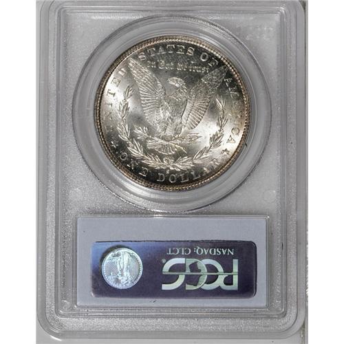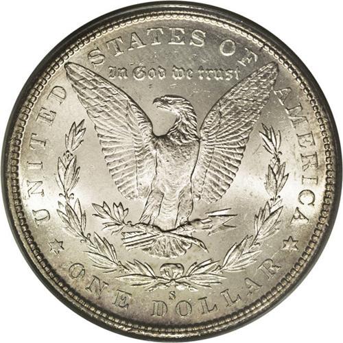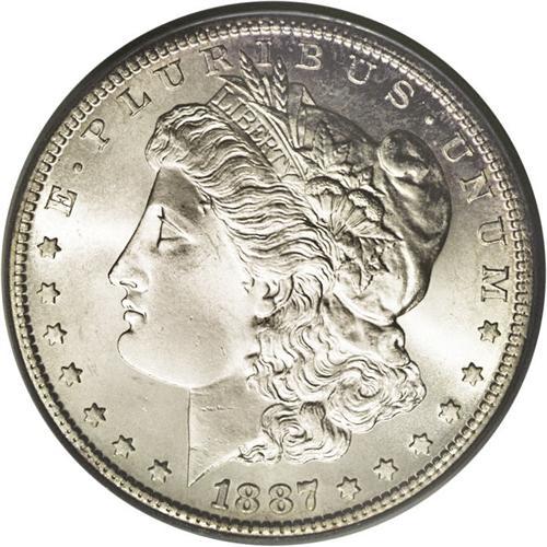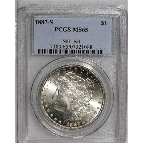 <B>1887-S<img border='0' src='http://www.heritagecoins.com/images/star.gif' width=10 height=10>$1> MS65 PCGS.</B></I> Ex: NFL Set. Although not widely represented in the Treasury release of 1962-1964, the 1887-S is a relatively available coin through the MS64 grade level. Many low grade Uncirculated coins probably emerged from federal holdings earlier in the 20th century. In addition, the LaVere Redfield Hoard contained perhaps 10 bags of Mint State 1887-S silver dollars. According to Wayne Miller, many of these coins were of "high quality," but since they were widely dispersed throughout the collecting community, Gem representatives do not appear with regularity in today's auctions. This is a beautiful, fully satiny coin whose surfaces are untoned save for blushes of champagne-lilac iridescence near the denticles. The strike is sharp and free of criticism, a fact that only enhances this coin's already impressive eye appeal.<BR><I>From The New York Eye Appeal Collection.</B></I>